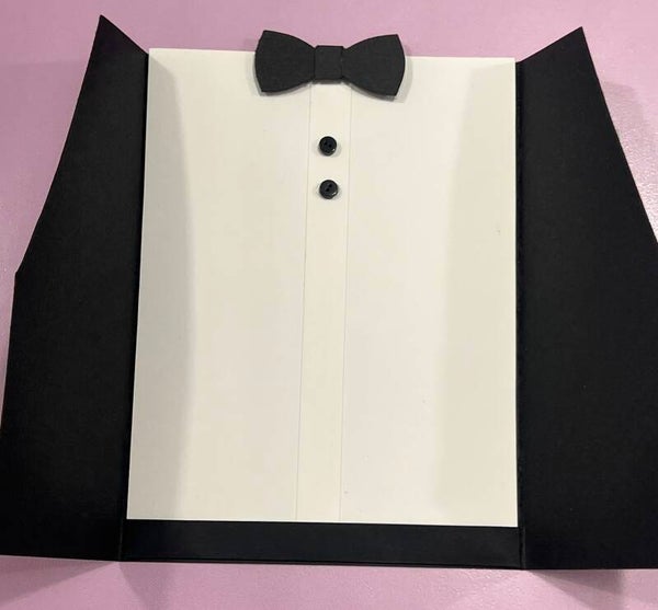 5x7 Black Tie Card made with cardstock paper. Shirt pulls out to write your message on. Made with real buttons and small plastic flowers for the boutonnière. Velcro is used to hold jacket shut. Great for weddings, anniversary, birthdays or any black tie event.