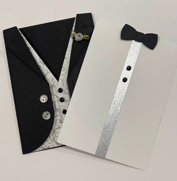 "Make a lasting impression with this stunning 5x7 handmade Black Tie Card. Crafted from quality cardstock, the innovative pull-out shirt design offers a unique way to deliver your heartfelt message. Details like real buttons and a charming silk boutonnière add a touch of undeniable luxury."