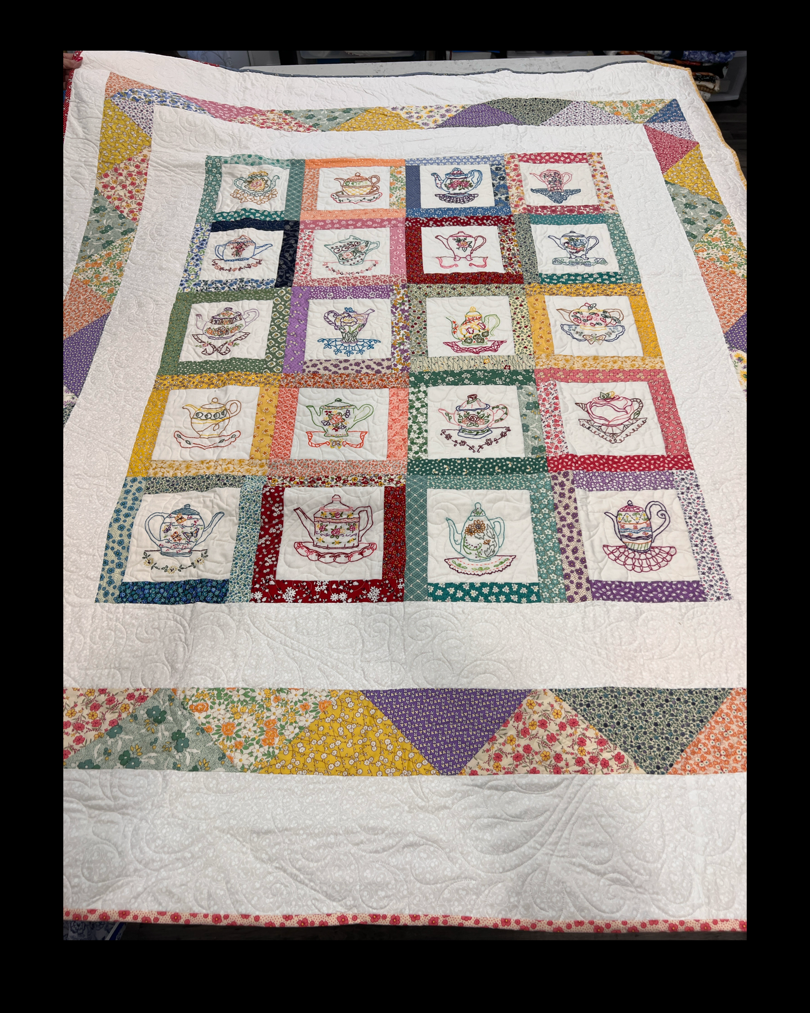 76"x61" This large throw is a Crabapple design. Handmade by MM, every block has been hand embroidered. 30's print fabric was used on the front and back. Consider hand-washing for extra delicate quilts, followed by air drying. Not recommended for any dryers. The blocks are delicate with the hand embroidery work.