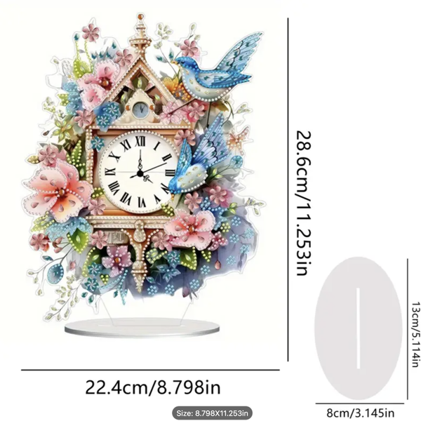 Brighten your desk or shelf with this diamond painting acrylic desktop clock. It features beautiful flowers and a blue bird design, adding a touch of sparkle to your home or office. This clock is battery-operated, and please remember that batteries are not included.