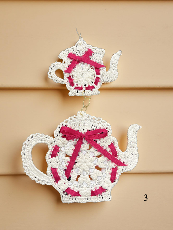 7" high Crocheted Teapot from MM are just stunning. Use as a wall hanging or ornament. Get them while they LAST. These are the last ones.