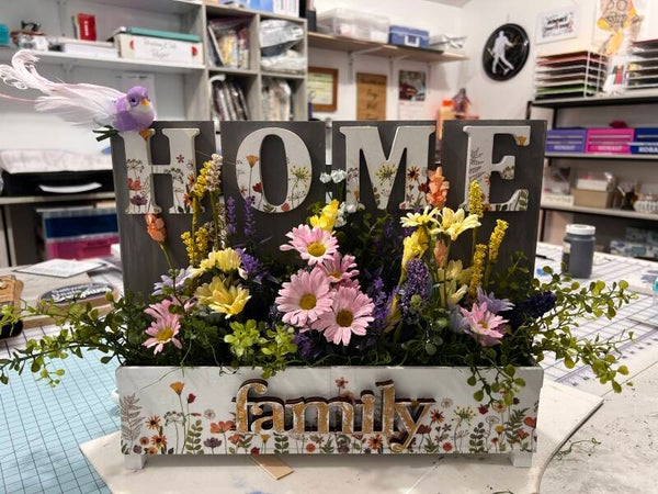 Handcrafted. Made out of wood, Home flower pot decor. Not entended for real flowers. Indoor use only unless under water proof roof. Silk flowers are included.