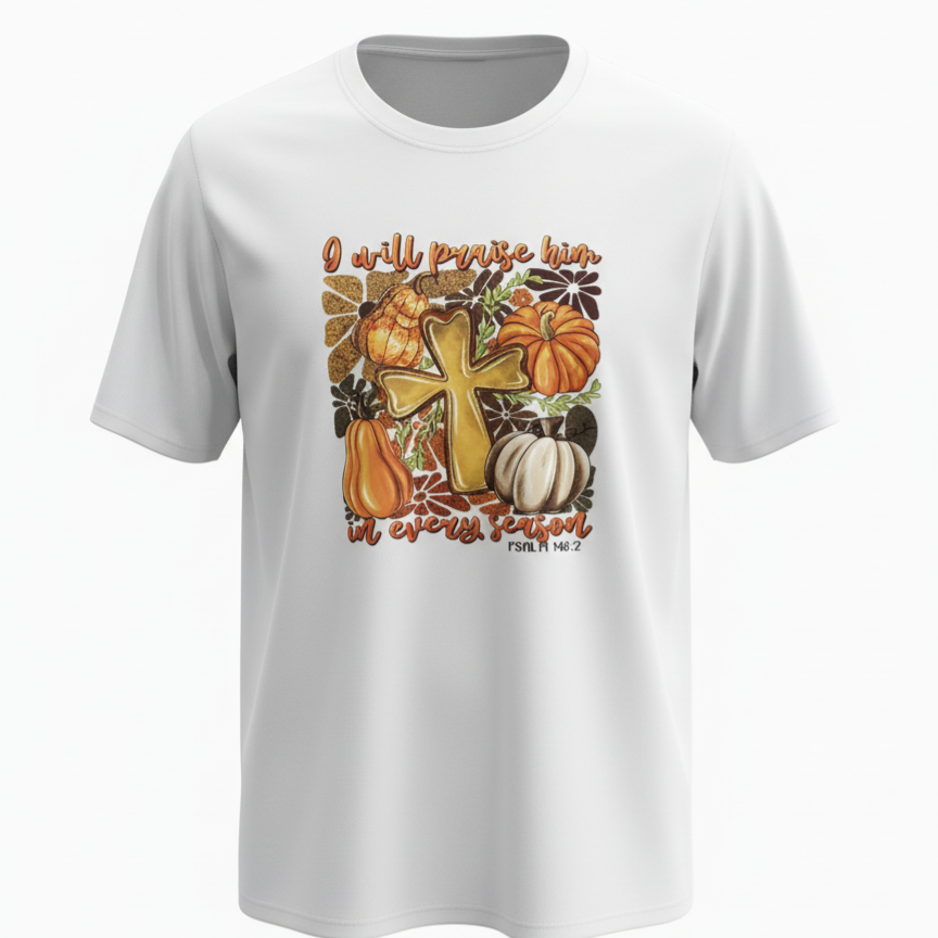 This white autumnal graphic tee features a heartfelt message of faith: "I will praise him in every season," inspired by Psalm 146:2. The beautiful fall-themed design showcases a golden cross surrounded by an array of colorful pumpkins and rustic floral accents.