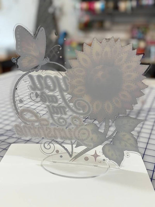 This acrylic diamond art piece, measuring 10" x 10", features a vibrant sunflower and a delicate butterfly. The design is complemented by the phrase "You Are My Sunshine" and set on a clear acrylic base.