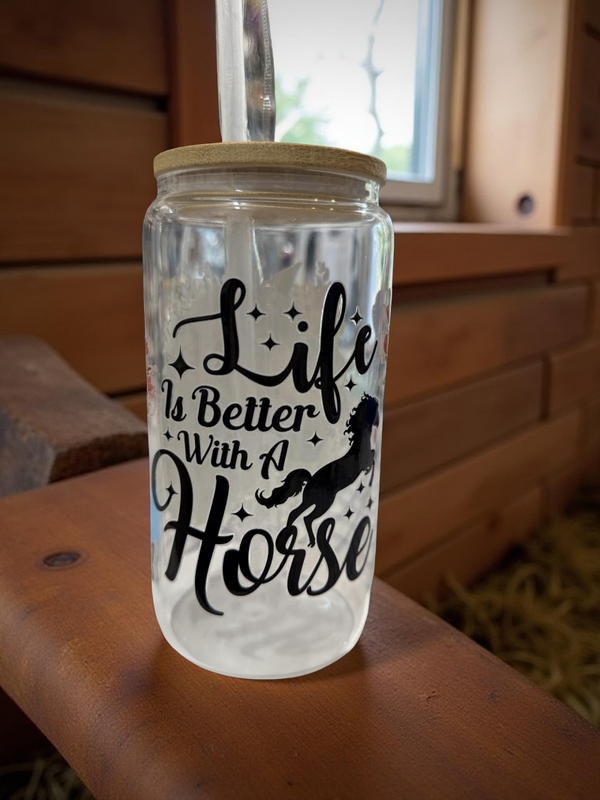 Gallop into style with this enchanting 16oz glass tumbler! Featuring a breathtaking horse framed by a vivid explosion of floral patterns, it's the perfect companion for your favorite cold beverages – from invigorating iced coffee to refreshing water. Each tumbler comes complete with a convenient plastic straw and a straw cleaning brush, ensuring effortless enjoyment and easy care.