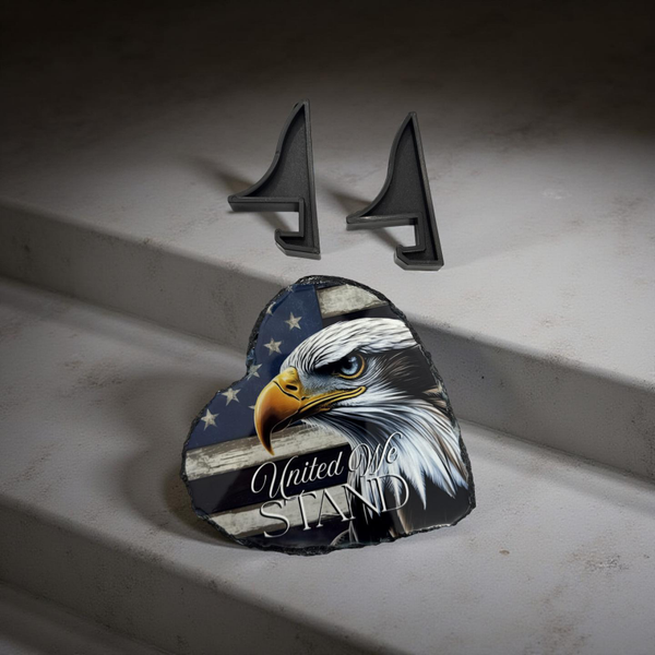 Show your patriotism with this unique heart-shaped slate plaque featuring a majestic bald eagle over a distressed American flag. The powerful message "United We Stand" is prominently displayed, making this a perfect piece for anyone who values freedom and country.