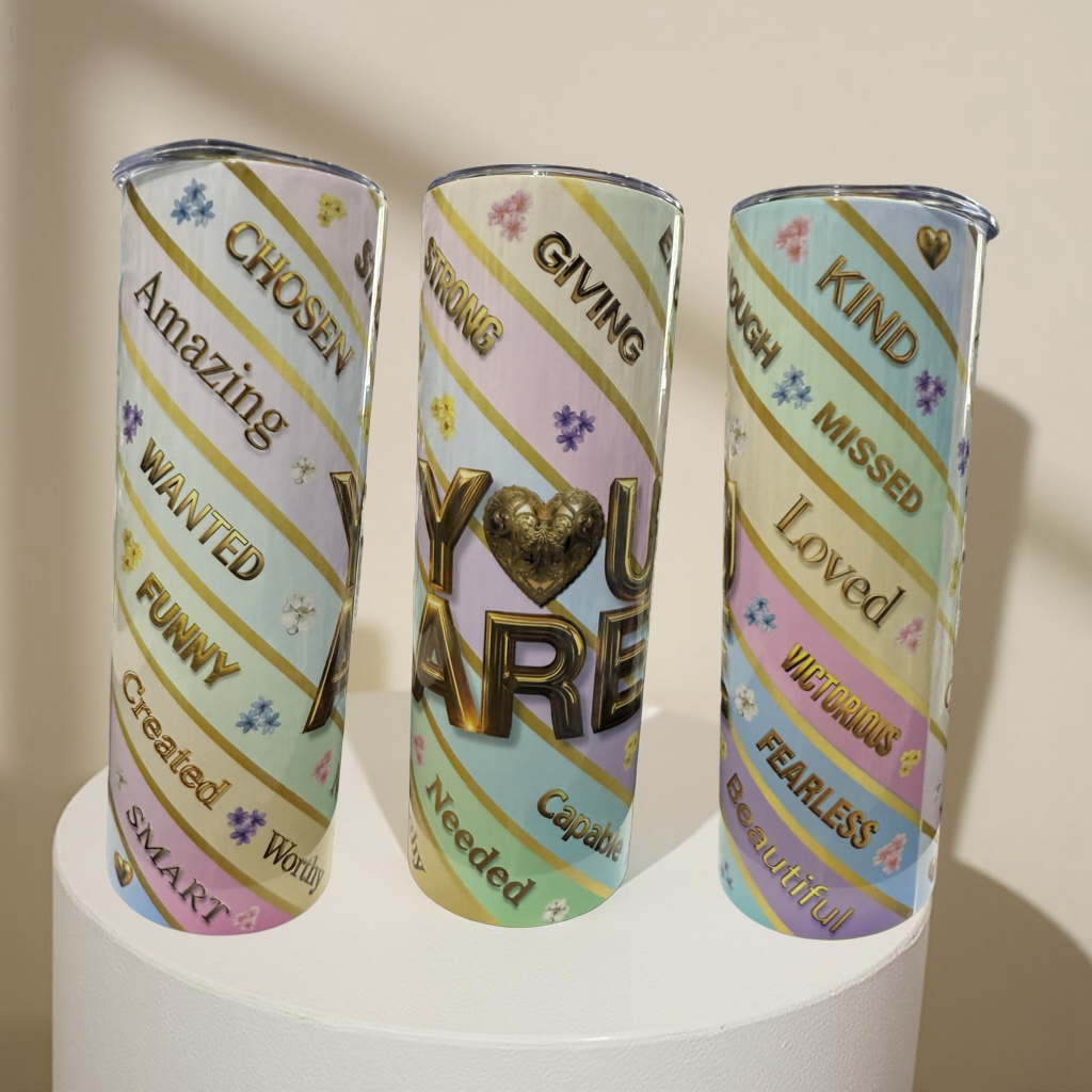 This 20 oz insulated stainless steel tumbler is designed to uplift and encourage anyone who might be feeling down or alone. The soft, pastel-colored stripes serve as a beautiful backdrop for a collection of powerful, affirming words, such as "Loved," "Worthy," "Strong," "Capable," and "Beautiful." The design prominently features the message "YOU ARE," with a heart at its center, to remind the user of their inherent value.
