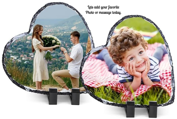 Create a one-of-a-kind keepsake with this customizable slate stone photo plaque. The rugged, natural edges of the 6x6-inch heart shape stone frame your chosen image beautifully, making it a unique piece of home decor. This plaque comes with a display stand, allowing you to showcase it on any shelf, desk, or mantel.