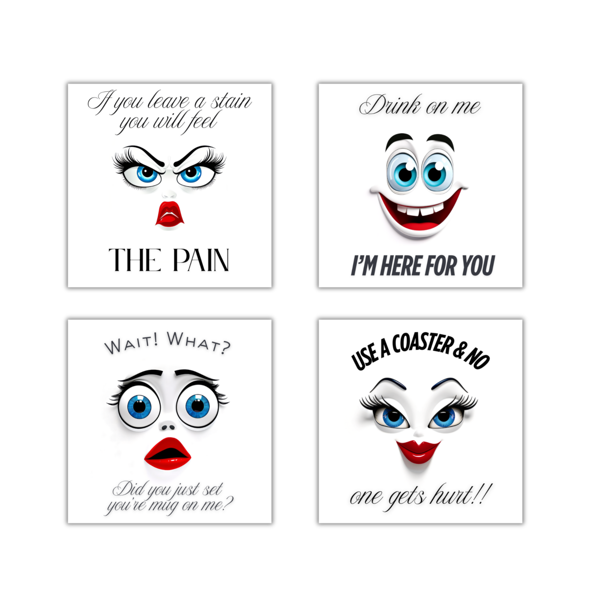 This set of four ceramic coasters adds a touch of humor and personality to any home. Each square coaster features a unique cartoon facial expression and a witty saying, serving as a playful reminder to guests to use a coaster. The set includes four distinct designs: