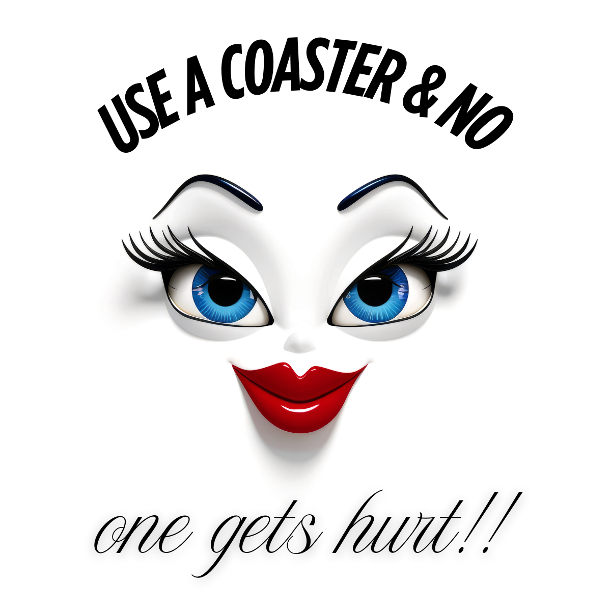 - A cunning, winking face with the firm command, "USE A COASTER & NO one gets hurt!!"