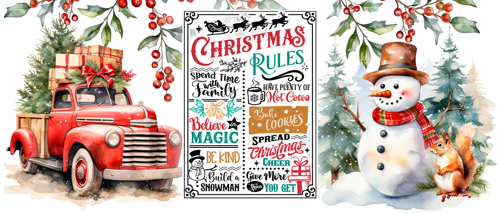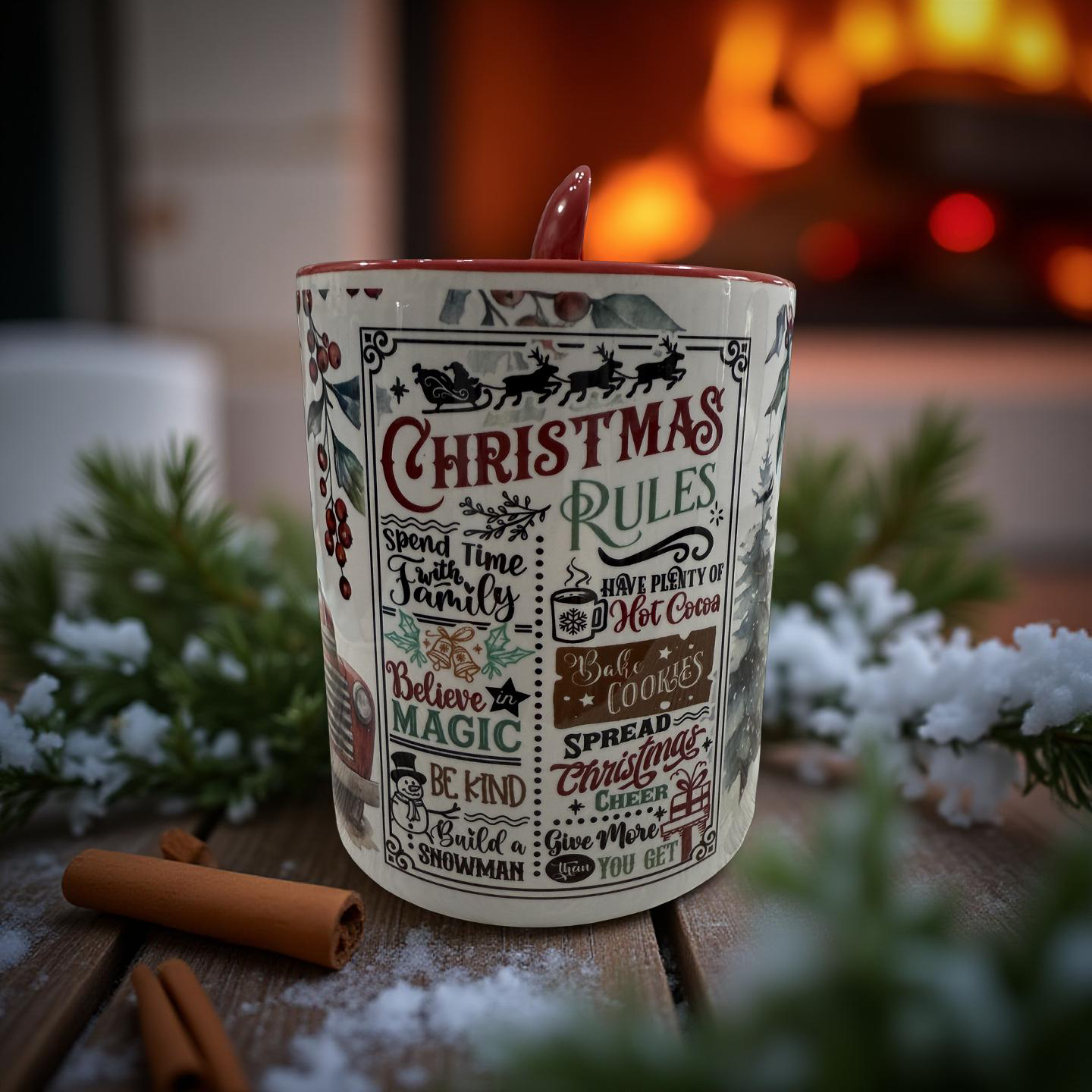 - Whimsical "Christmas Rules" Design: The mug features a fun, comprehensive list of holiday "rules" in a decorative script, including "Spend Time with Family," "Have Plenty of Hot Cocoa," "Believe in Magic," and "Build a Snowman."