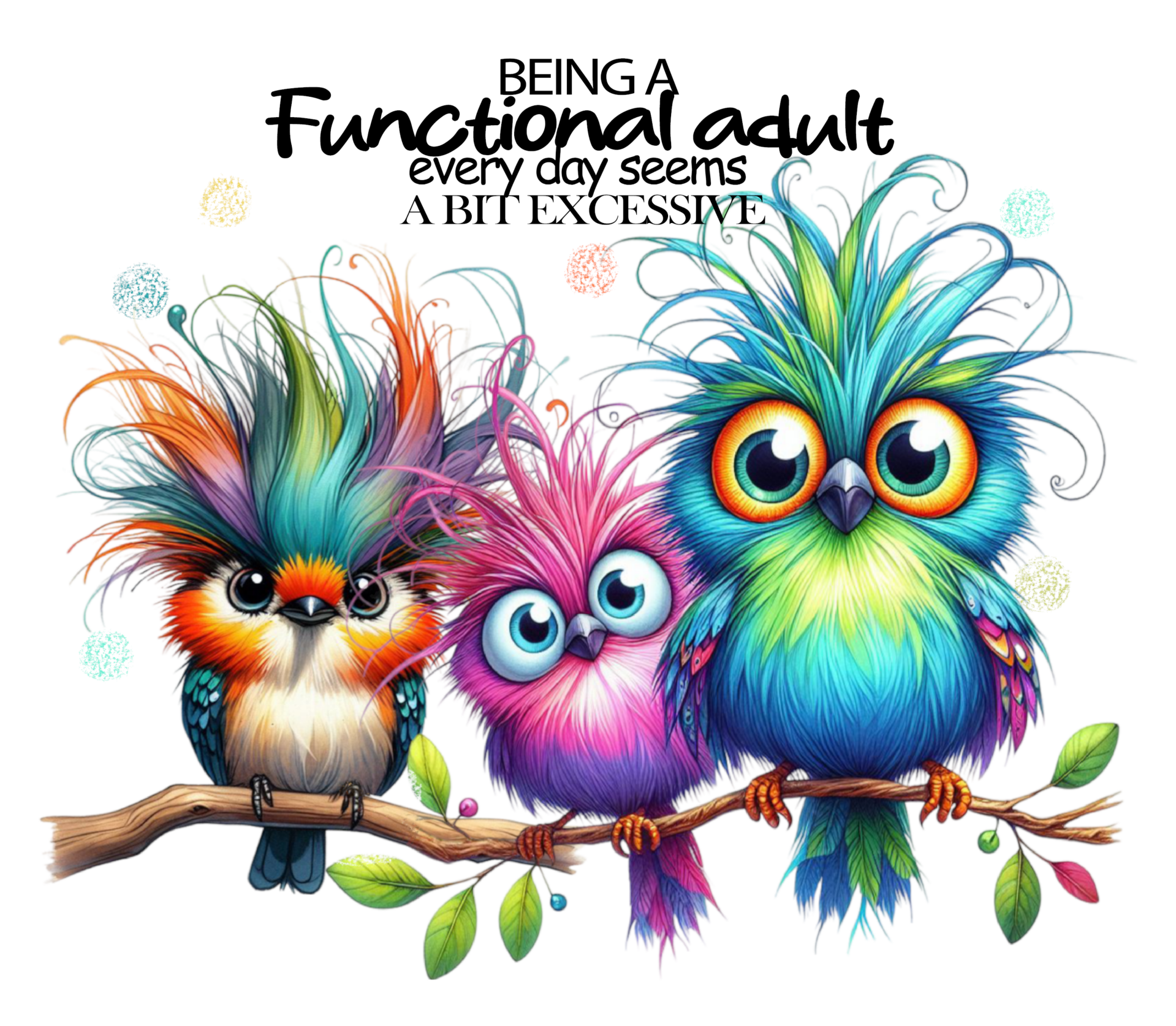 Stay hydrated with a dose of humor! This eye-catching, custom-made tumbler features three quirky, colorful owls and the highly relatable quote, "Being a functional adult every day seems a bit excessive". It’s the perfect statement piece for home, the office, or on the go.