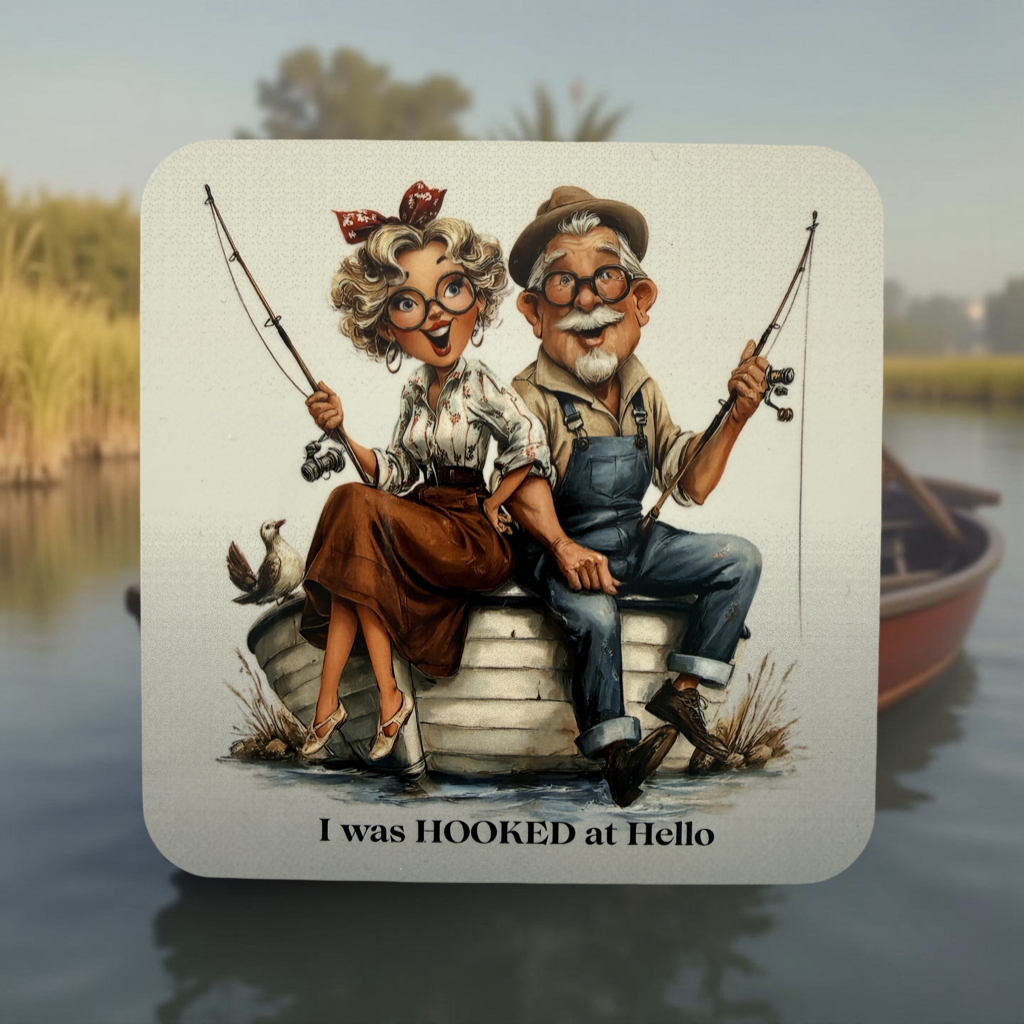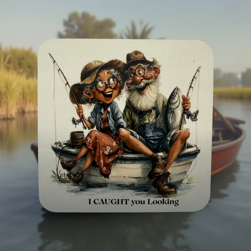 Bring a touch of humor and charm to your home decor with this delightful set of four handcrafted coasters. Featuring whimsical illustrations of an elderly couple enjoying a day of fishing, each coaster is paired with a clever, fishing-themed pun that's sure to make you and your guests smile.