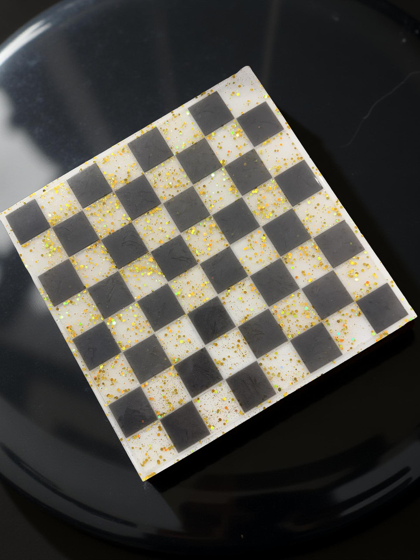 - Elegant Design: The contrasting black and white squares are infused with shimmering gold flakes, creating a striking, high-end, and captivating aesthetic.