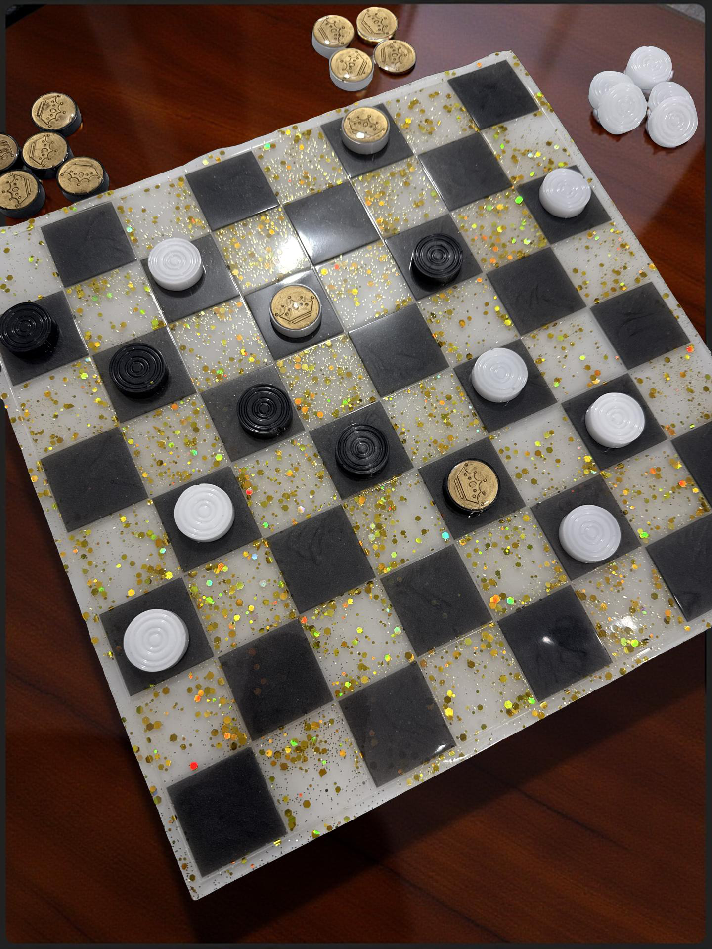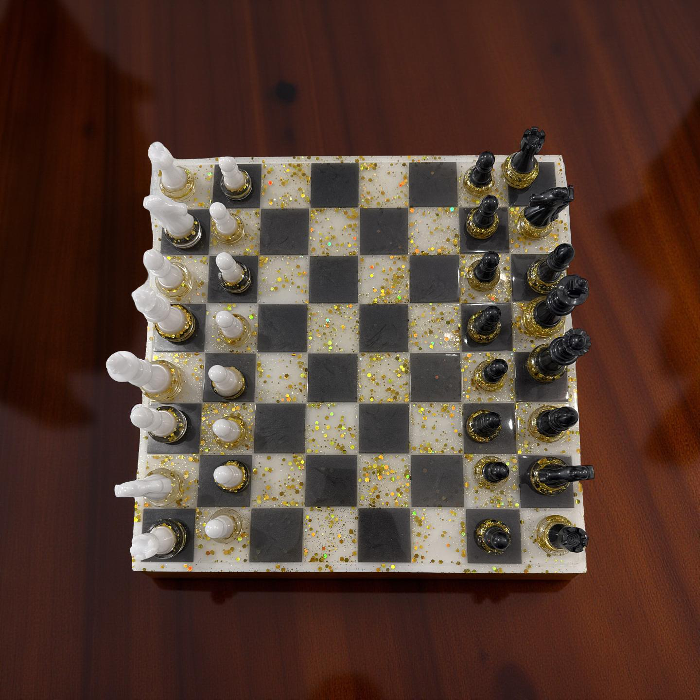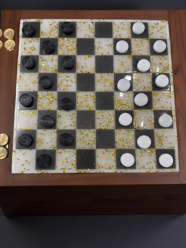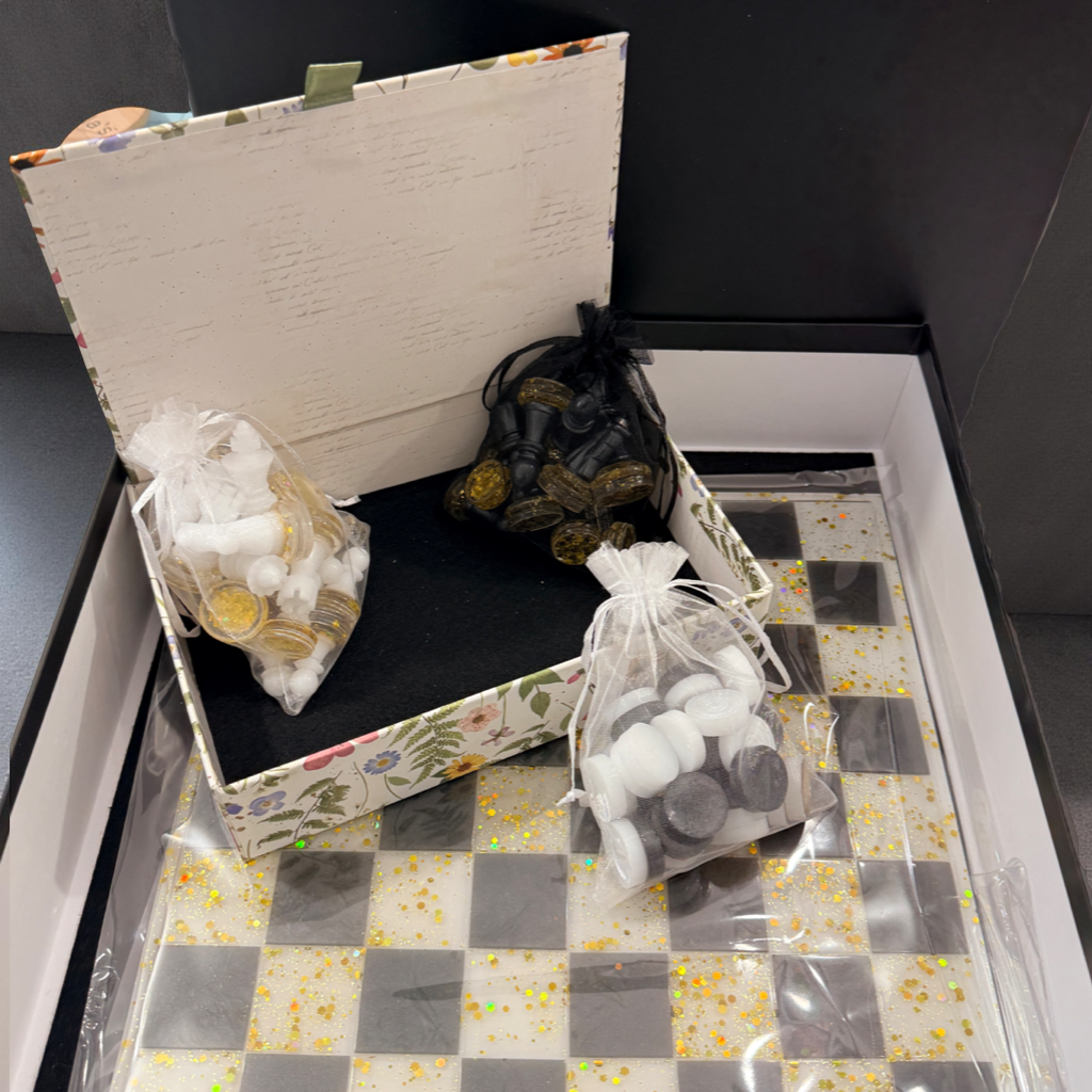 Elevate your game night and home décor with this stunning, one-of-a-kind resin art piece. Lovingly hand-poured by a new artist, this set transforms a classic strategy game into a luxurious modern art statement.