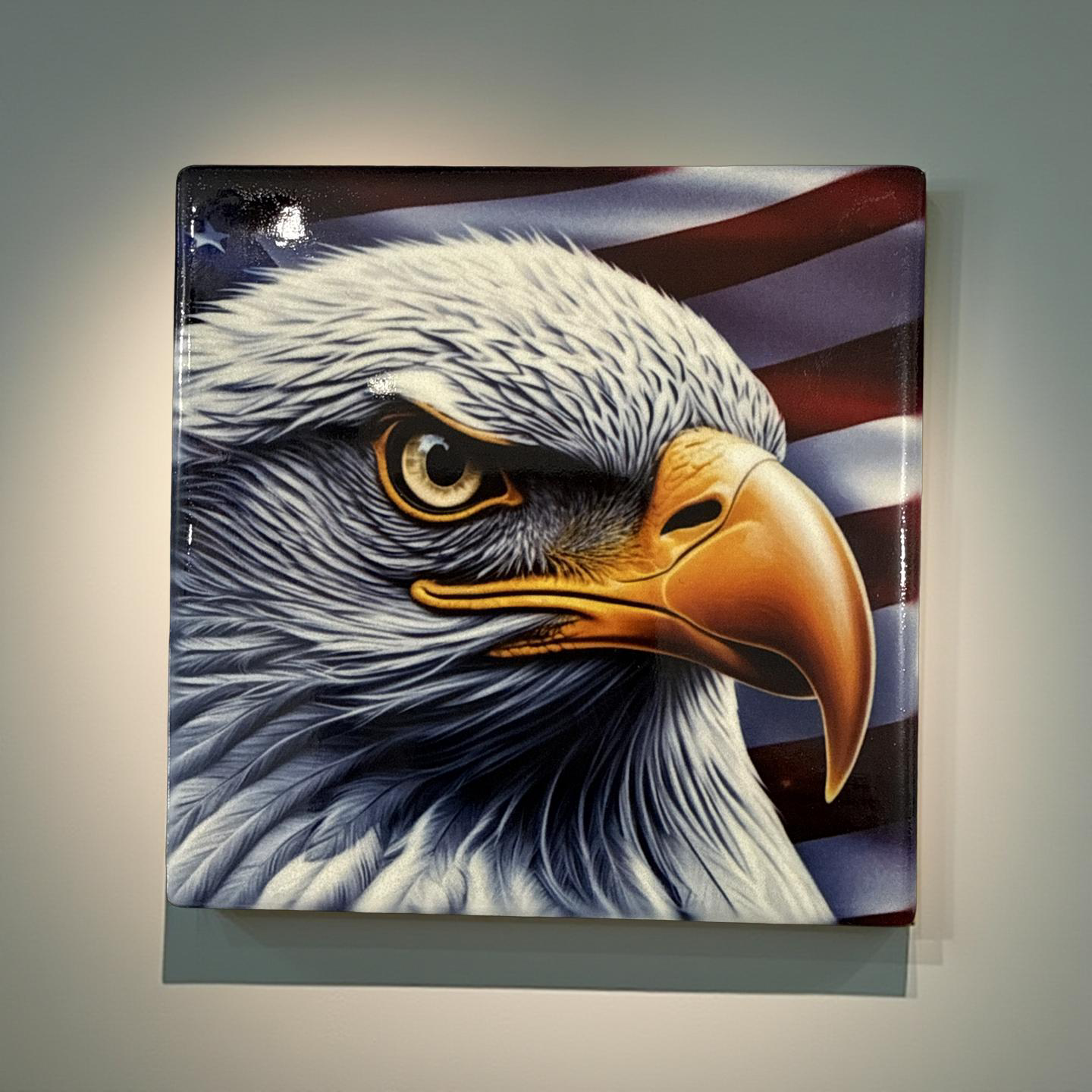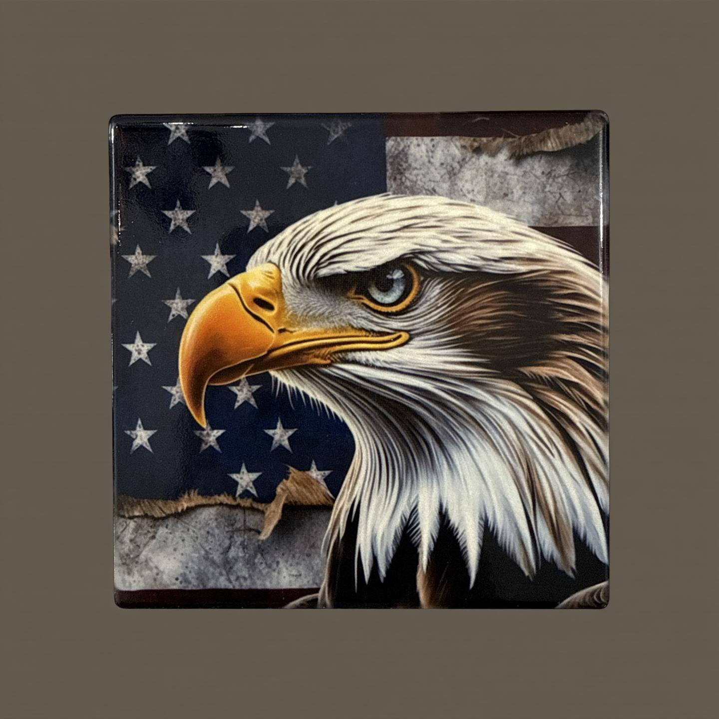 Display your American pride with this stunning set of four handcrafted ceramic coasters. Each coaster features a bold, detailed graphic of a bald eagle's head set against a stylishly distressed American flag, combining a classic Americana aesthetic with functional design.