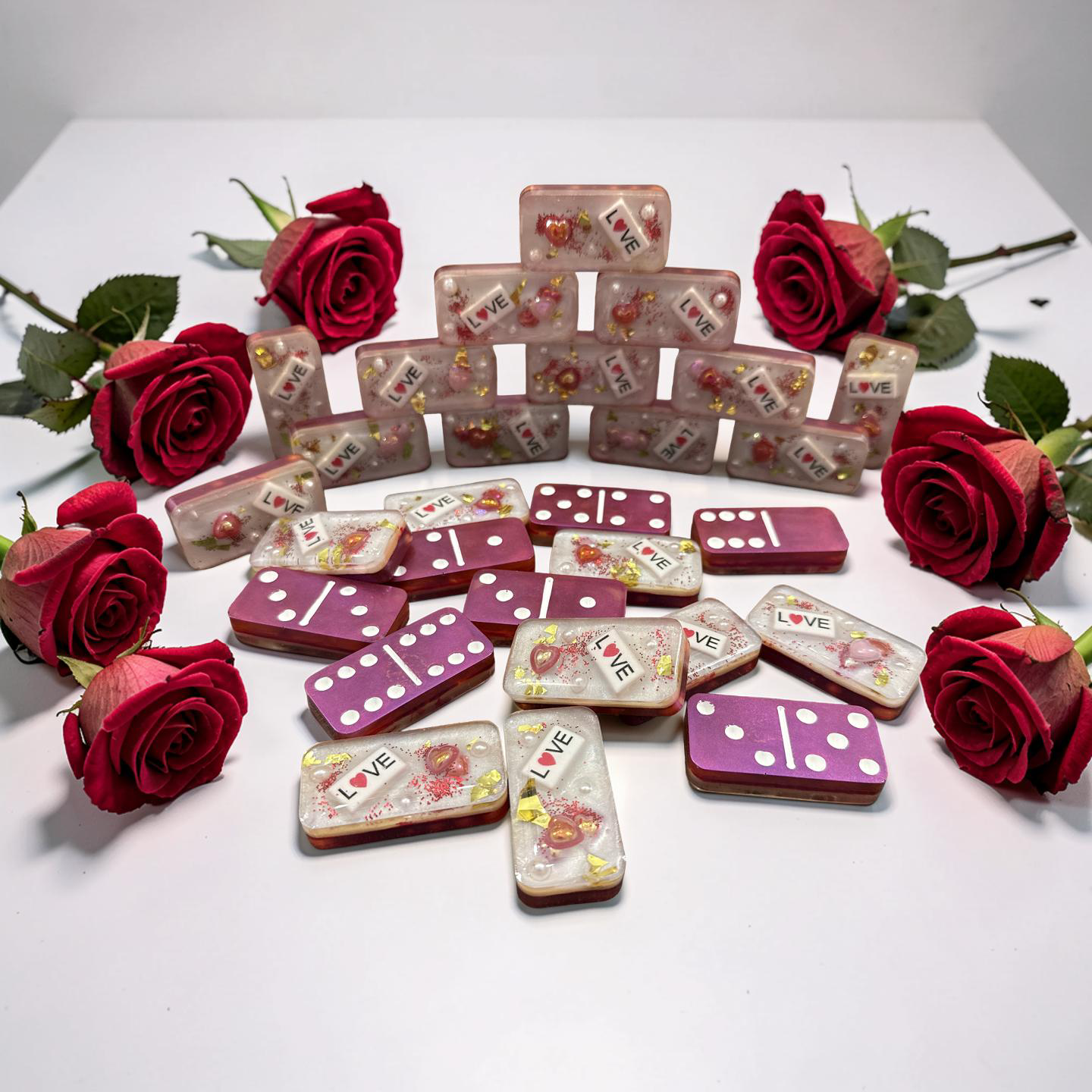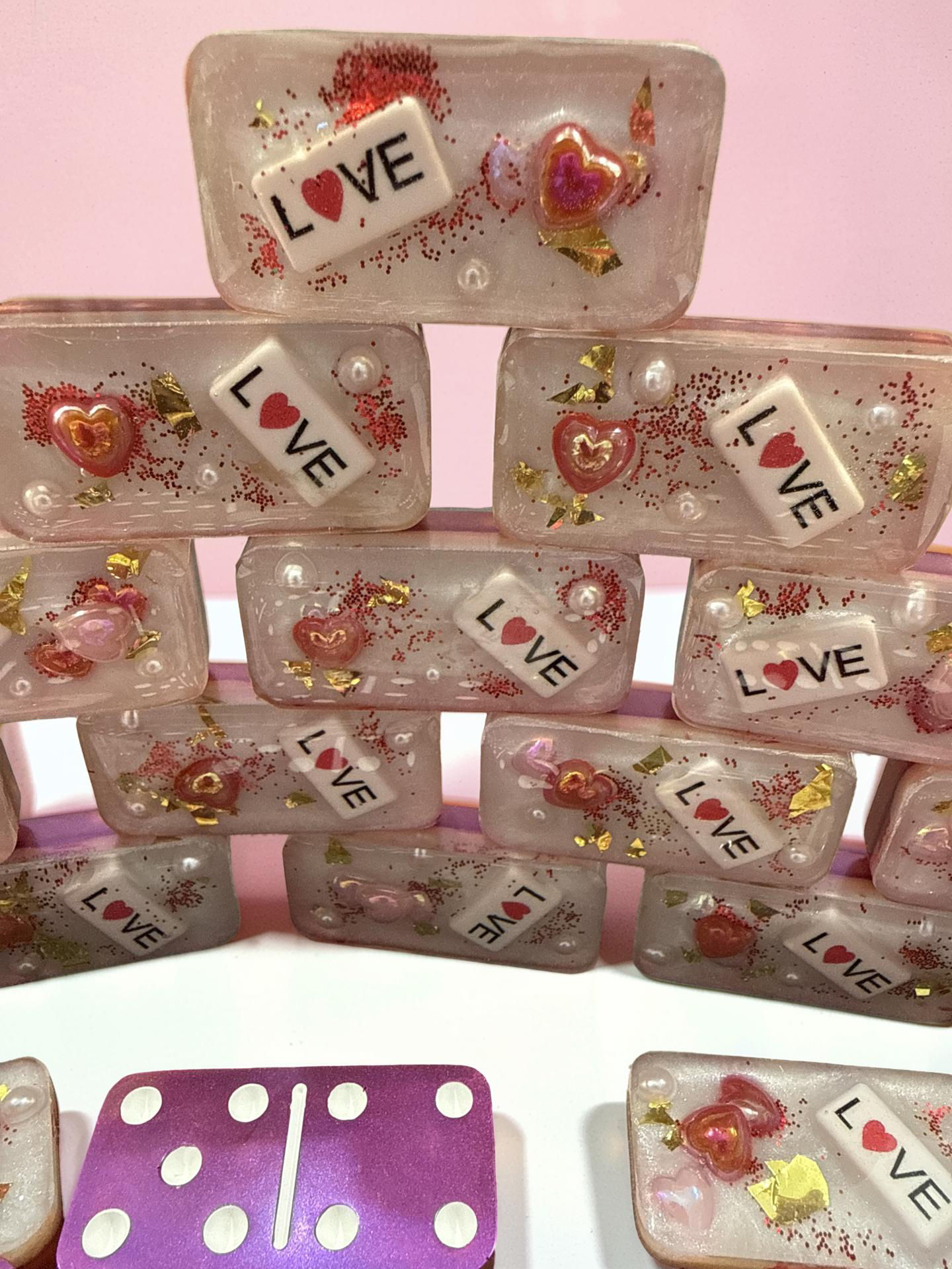 - Custom Artistry: Each domino is individually poured with a clear top layer, encapsulating shimmering glitter, delicate gold leaf flakes, and "Love" letter beads.